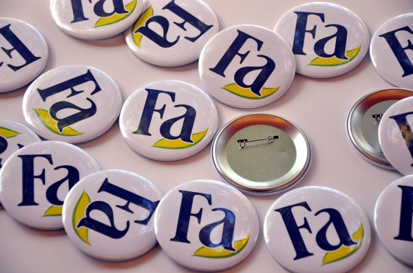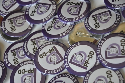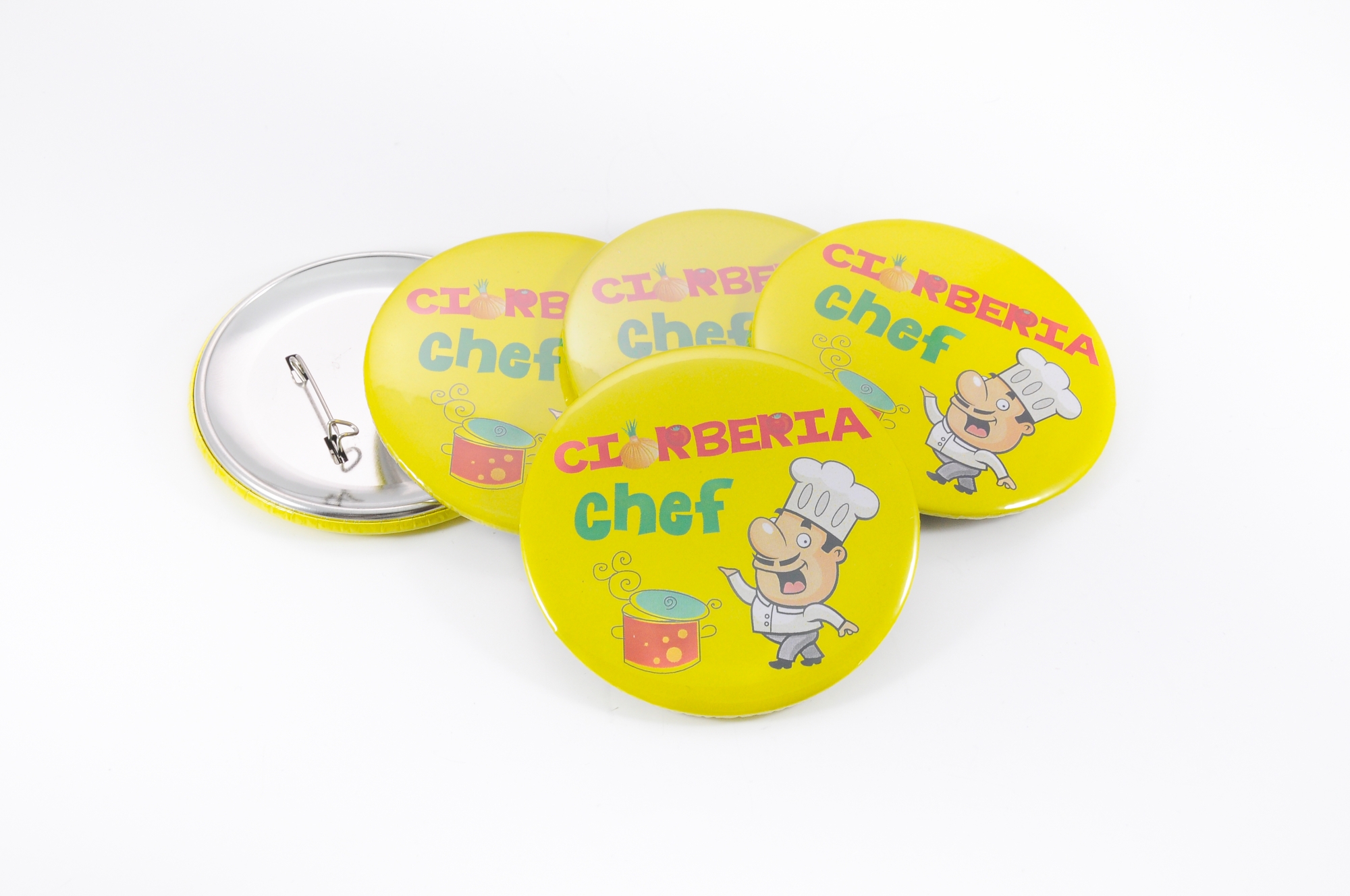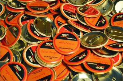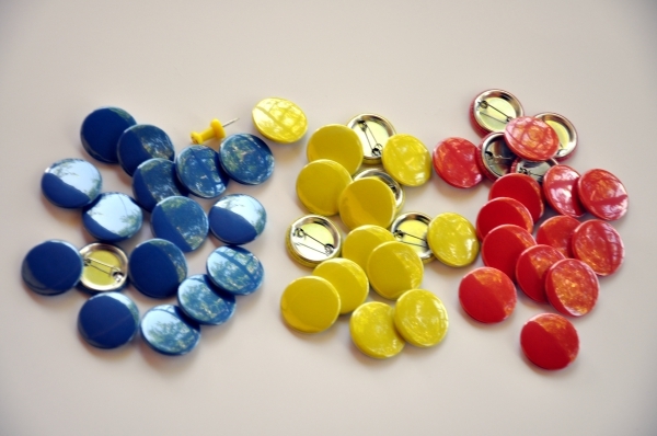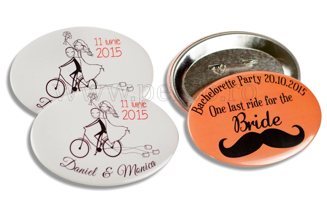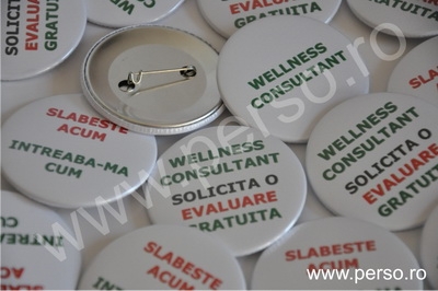 Se confectioneaza prin capsarea unor componente speciale metalice. Se prind in piept cu ac. Sunt personalizabile cu orice numar de culori.