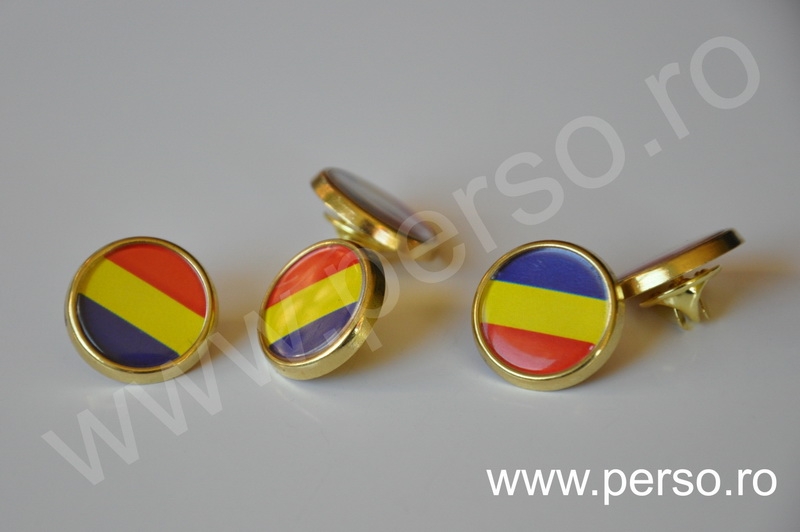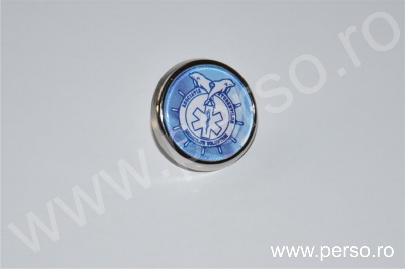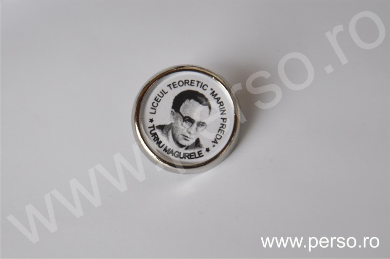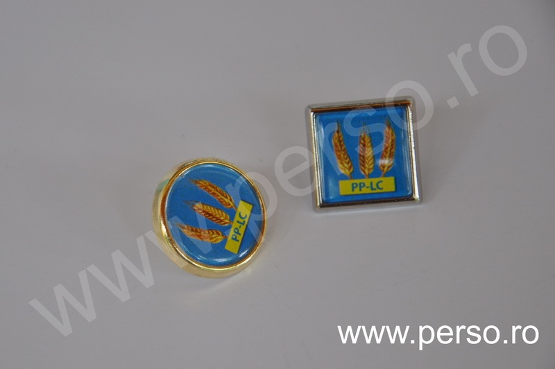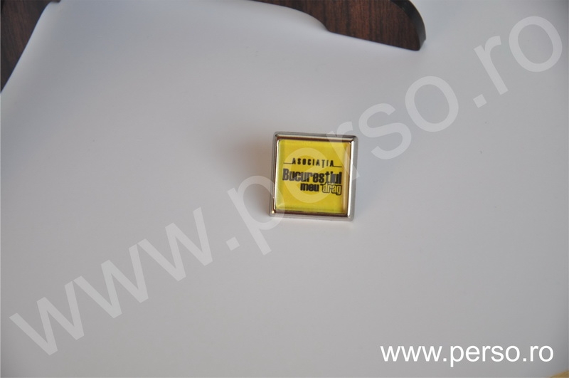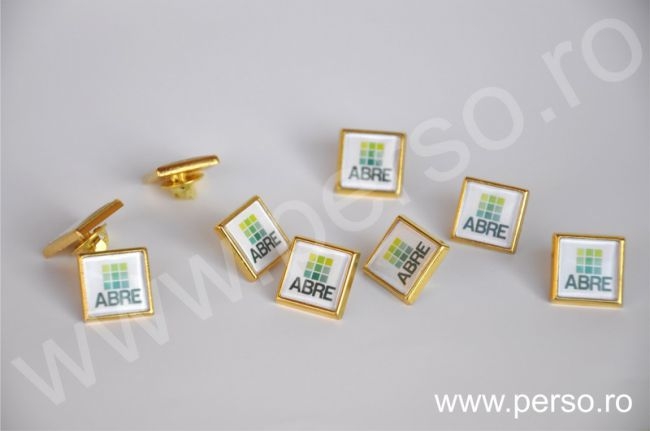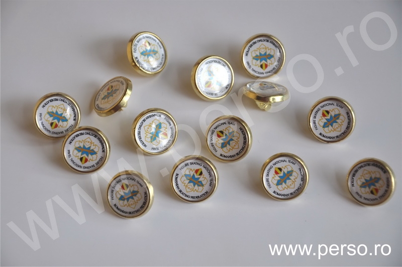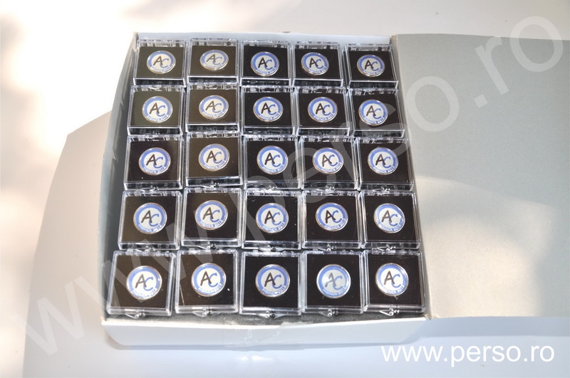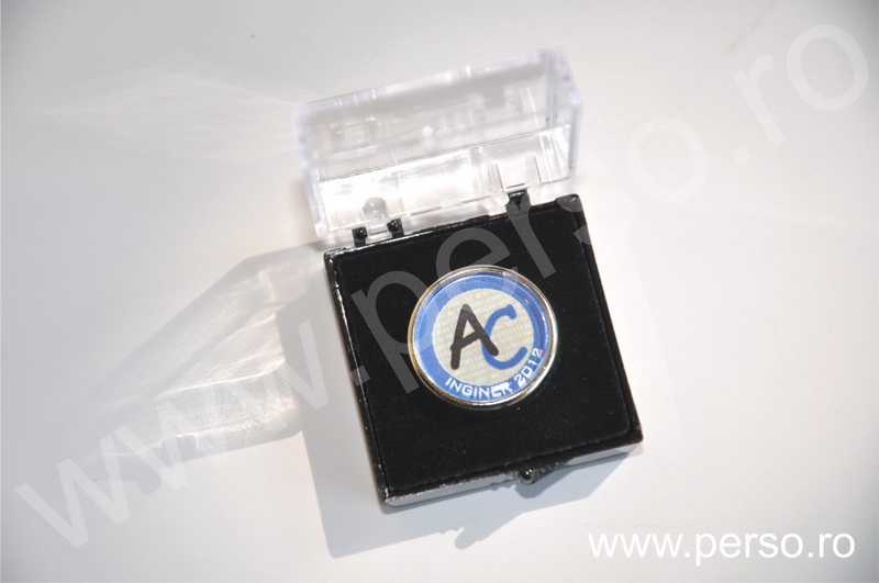 Insignele sunt formate din baze metalice aurii sau argintii, print personalizat color si capac transparent capsat
