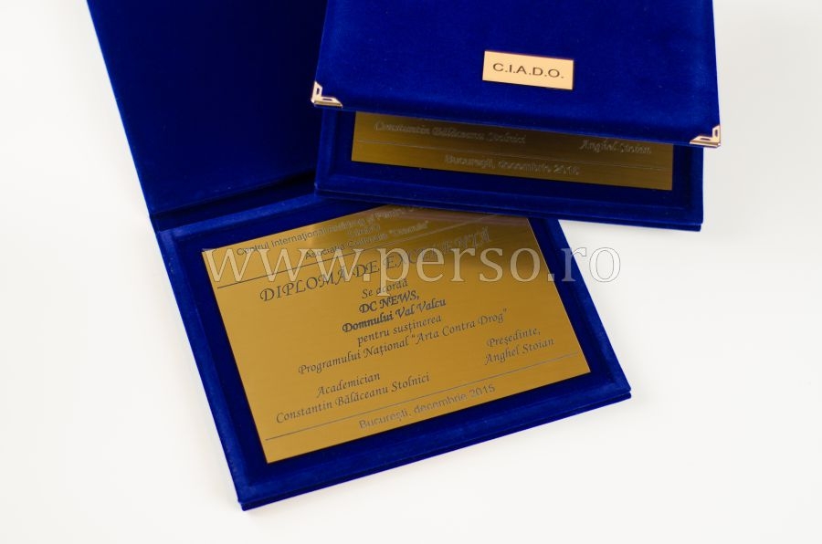 AMape de prezentare 200x150 mm personalizate cu placute gravate sau printate. Placutele pot fi din metal sau din plastic cu aspect metalic.