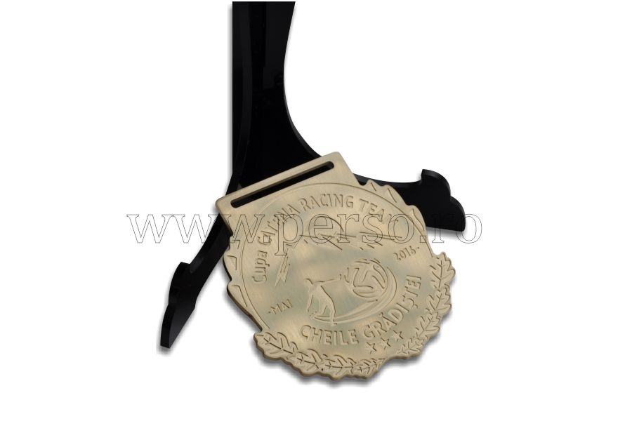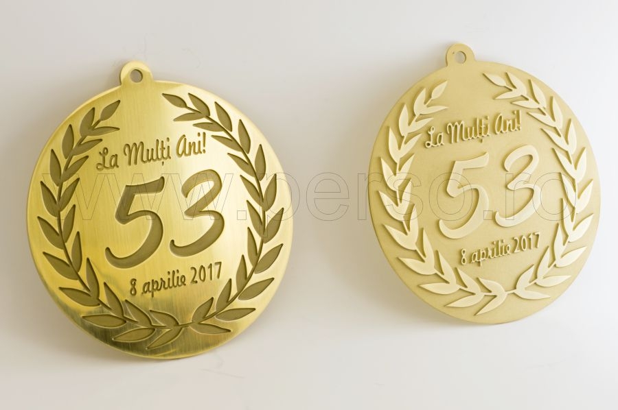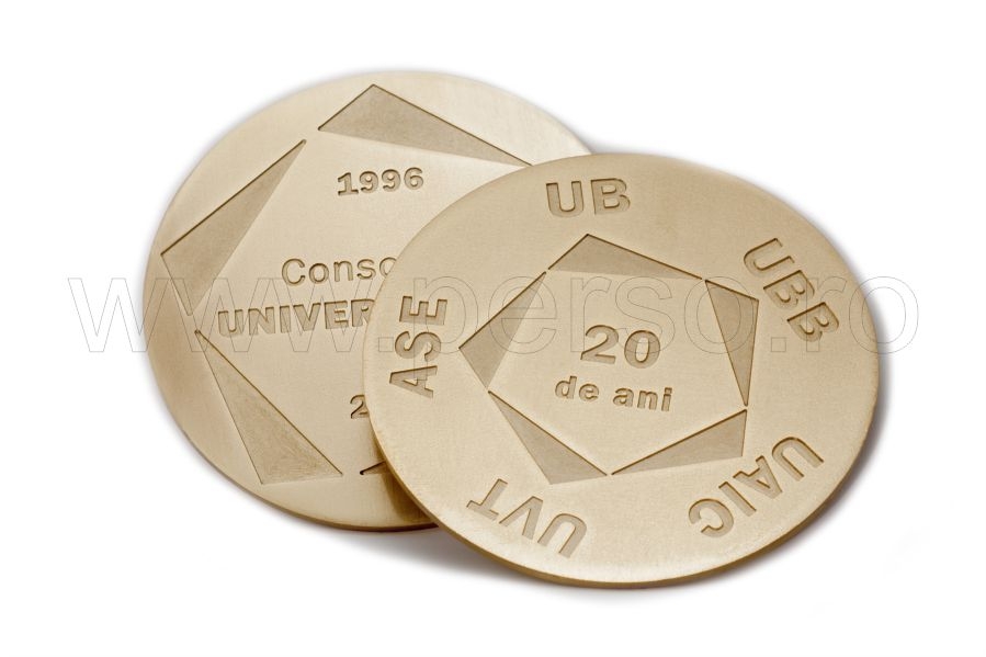 Medalie realizata din alama masiva gravata mecanic prin frezare in adancime in negativ sau pozitiv.