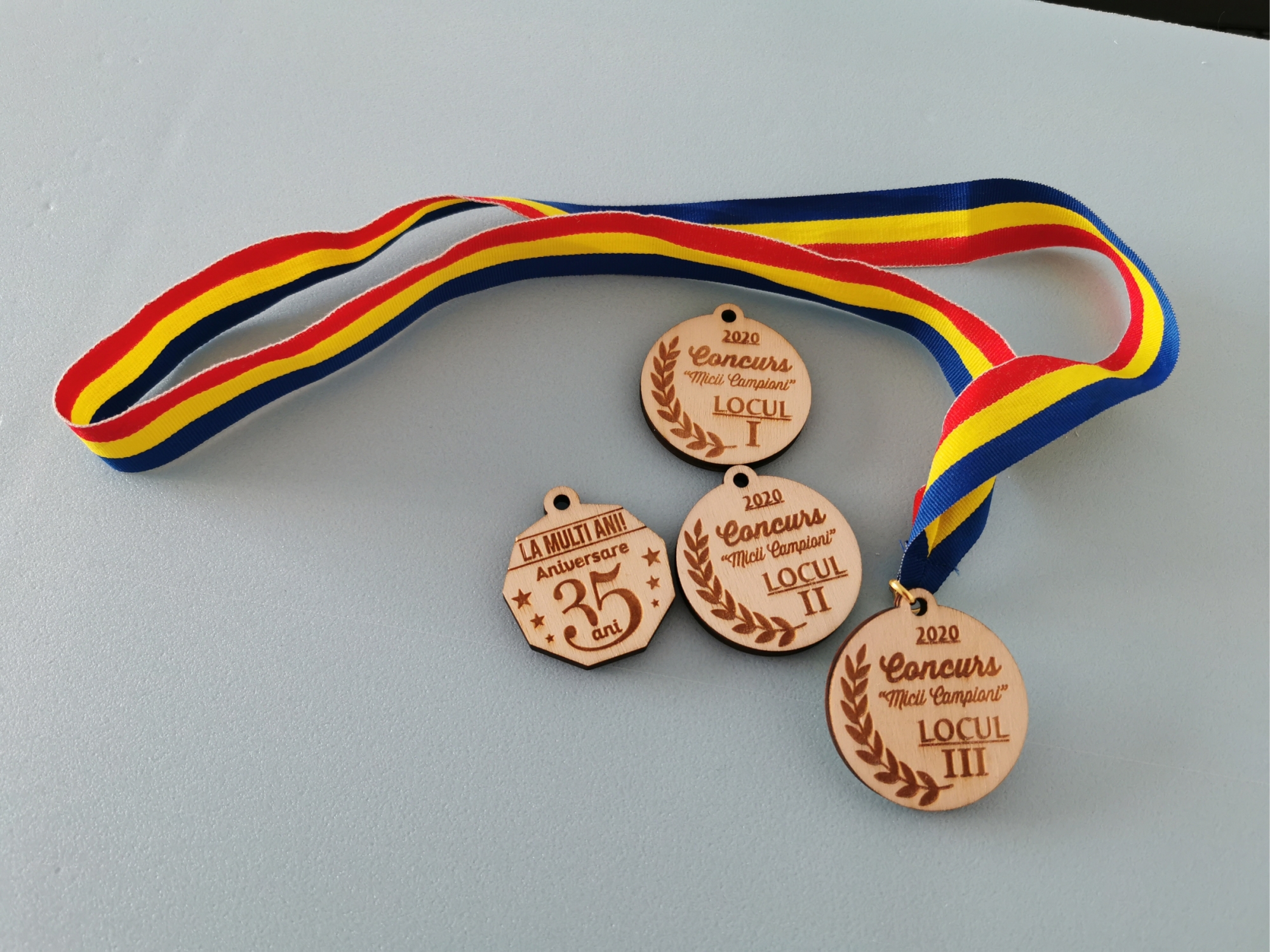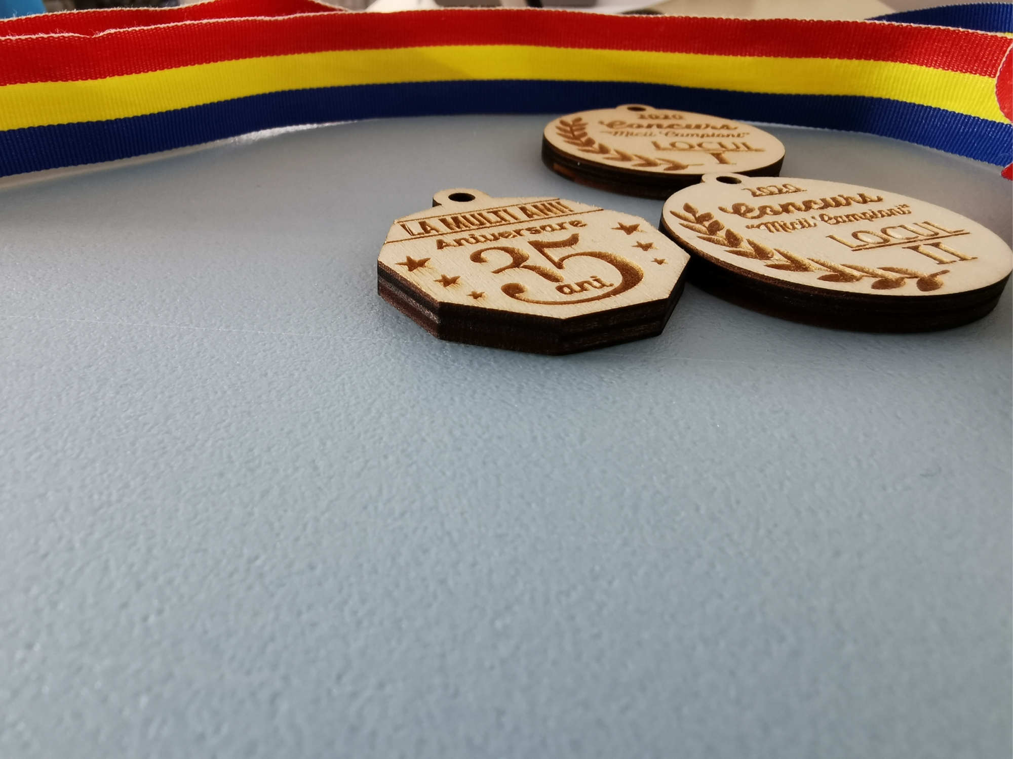 Medalii realizate din lemn, gravate laser. Pot fi confectionate din lemn, placaj, MDF, sau alte materiale.