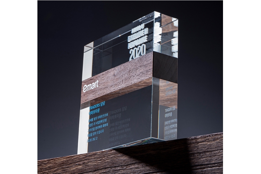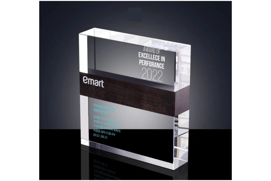 Trofeu deosebit din cristal cu grosime care asigura stabilitatea. Acest trofeu are o insertie din lemn culoare inchisa.