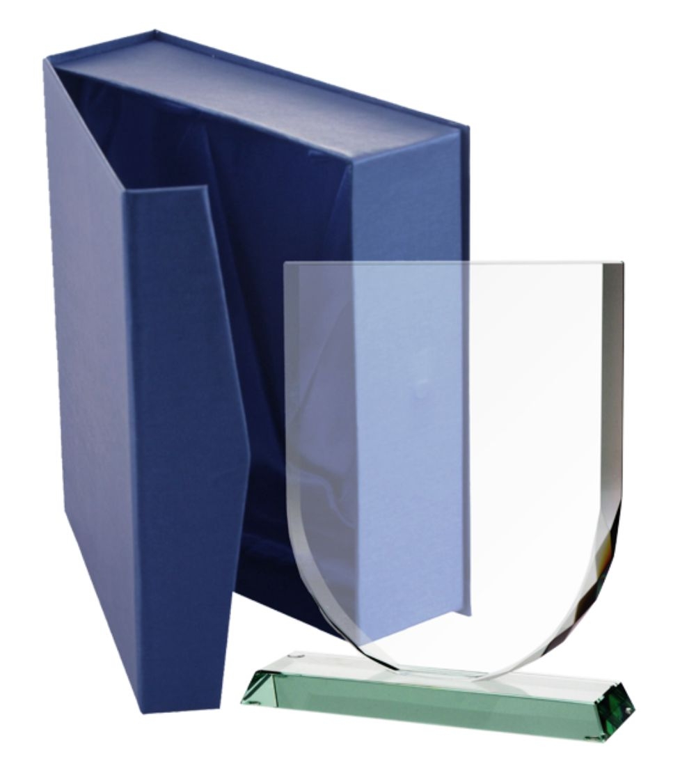 Trofeu de calitate din sticla de aprox 1,5 cm grosime ambalat in cutie de prezentare albastra.